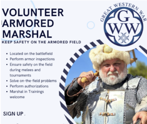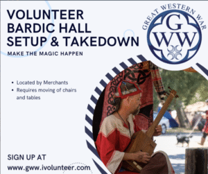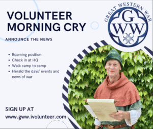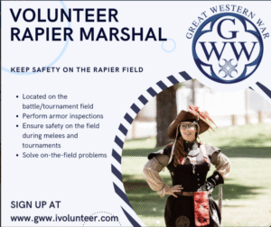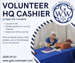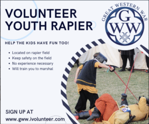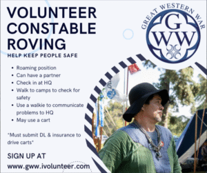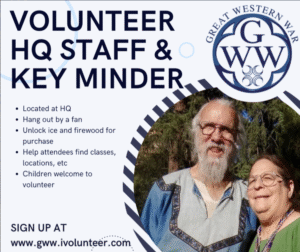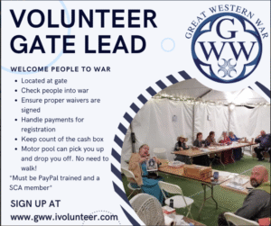 Great Western War volunteering is a chance to be involved with the inner workings of a major event and to meet other incredible people who share your commitments. Every hour you volunteer—at any task—at Great Western War also helps relieve the pressure on an overworked Event Steward, and you get raffle tickets that can get you cool stuff for your kit! There are many War volunteer opportunities that involve sitting, schmoozing, mocking, snarking, giggling, pointing and laughing; all valuable skills in both the SCA and modern life.You will also get to meet a wealth of interesting people, including possible boon companions, potential future accomplices and alibis, and maybe your one true love.
