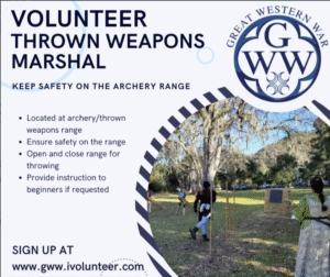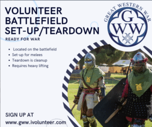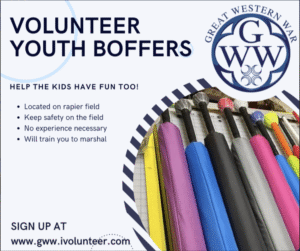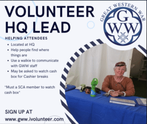 We appreciate all volunteers and have a wonderful raffle set up to reward those who take at least a couple hours out of their war to help make it run smoothly. The raffle will be held in A&S on Sunday at noon.